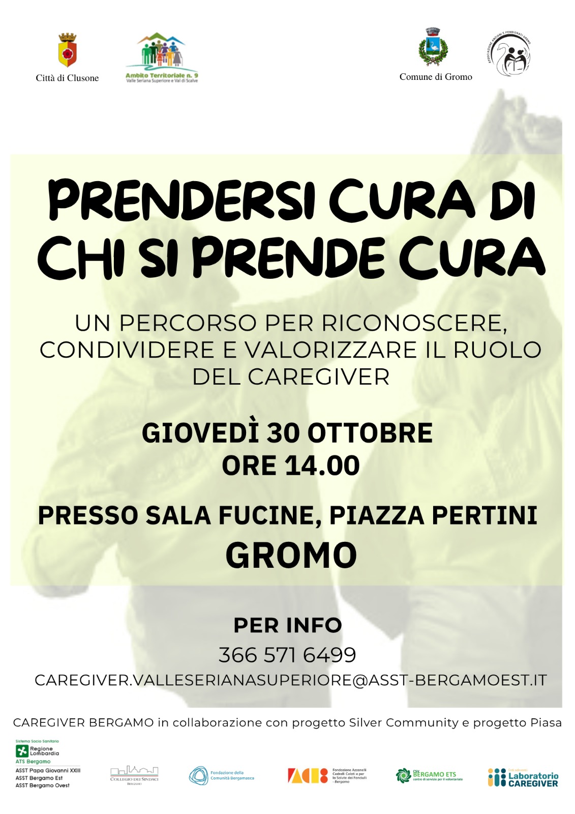 Il giorno 30 ottobre alle ore 14:00 presso la Sala Fucine in Piazza Pertini a Gromo si terrà un incontro dedicato ai caregiver famigliari del territorio. La proposta si inserisce all’interno di “Caregiver Bergamo- Accanto a chi si prende cura”, progetto di rete che vuole offrire supporto pratico e mirato a tutte quelle persone che all’interno delle proprie famiglie si prendono cura di un genitore, di un fratello, di un figlio, di un parente o anche di un amico.
